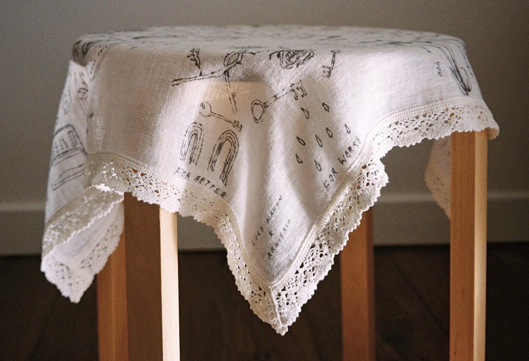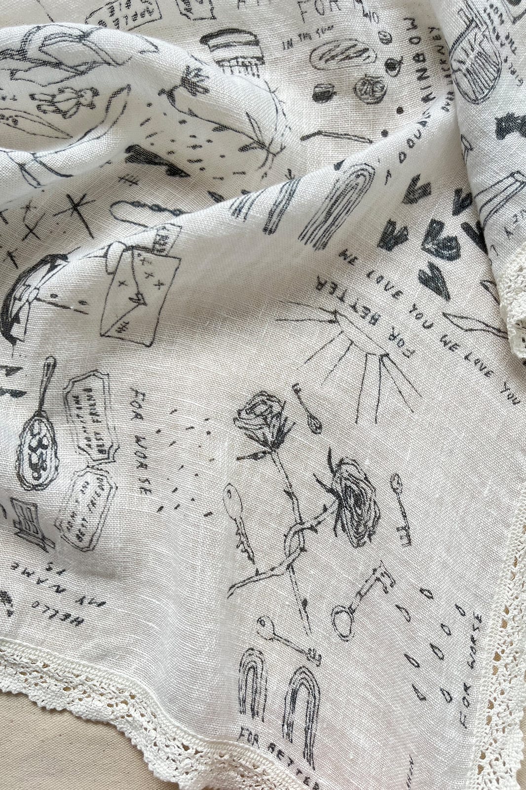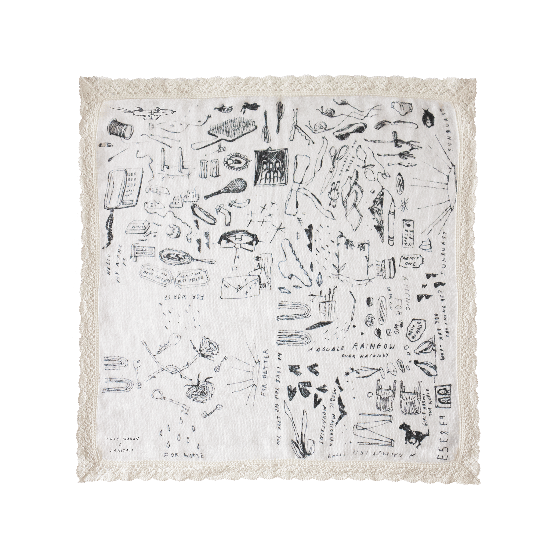 This first edition consists of a wearable piece of art that’s edged with reclaimed linen lace and a versatile pouch. Both pieces are cut from sustainably sourced, European linen and printed with a hand-drawn, detailed artwork.