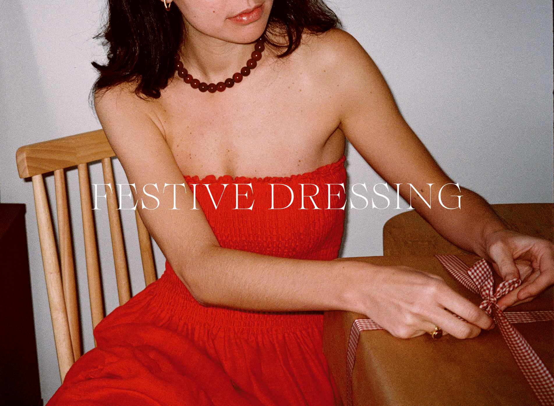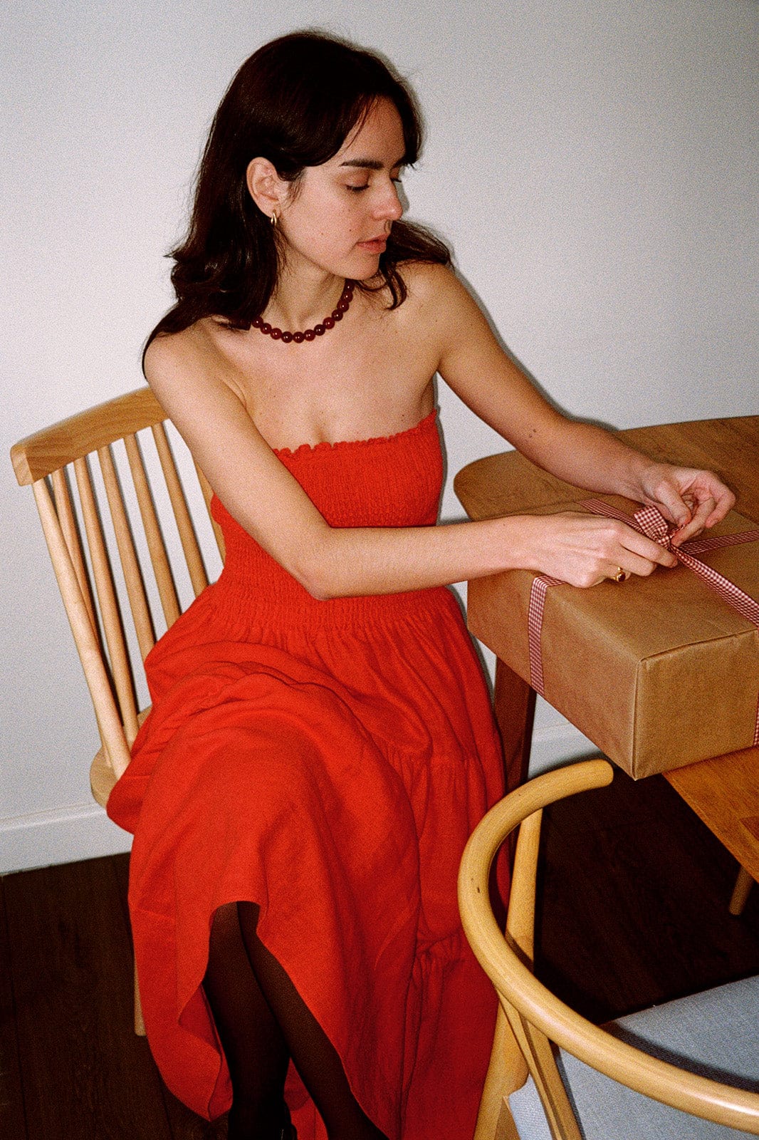 Wear this fiery red bandeau dress with tights, a black blazer and a chunky necklace for a relaxed yet chic Christmas outfit.