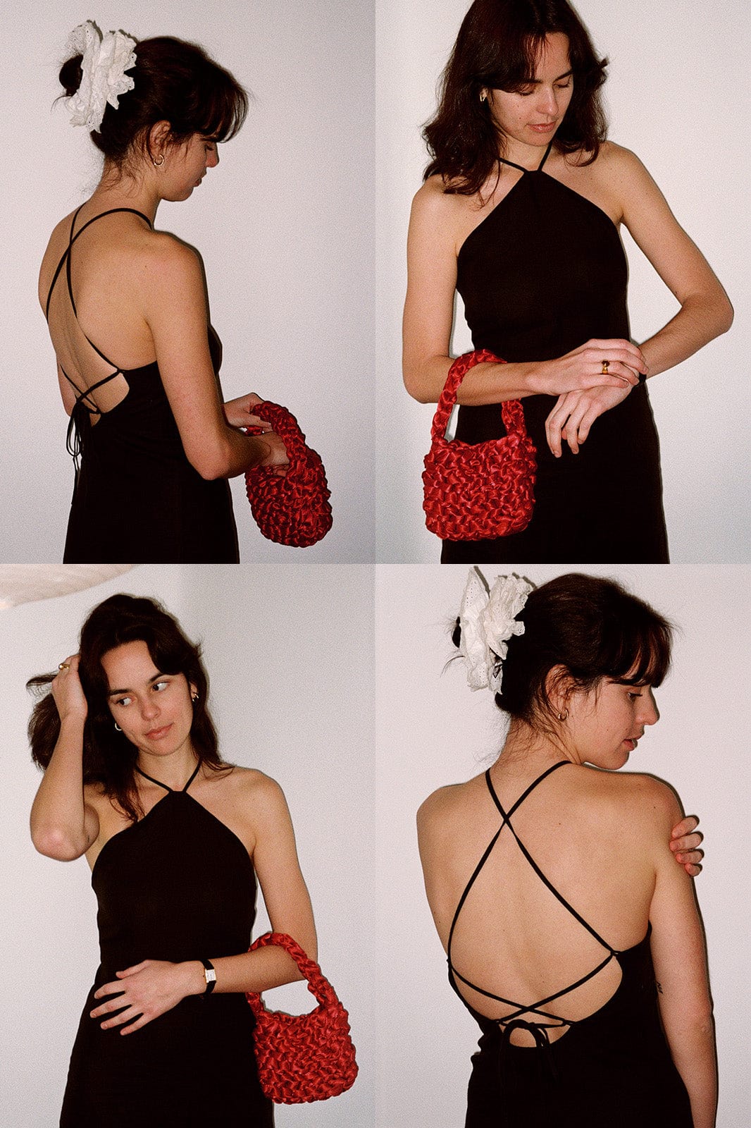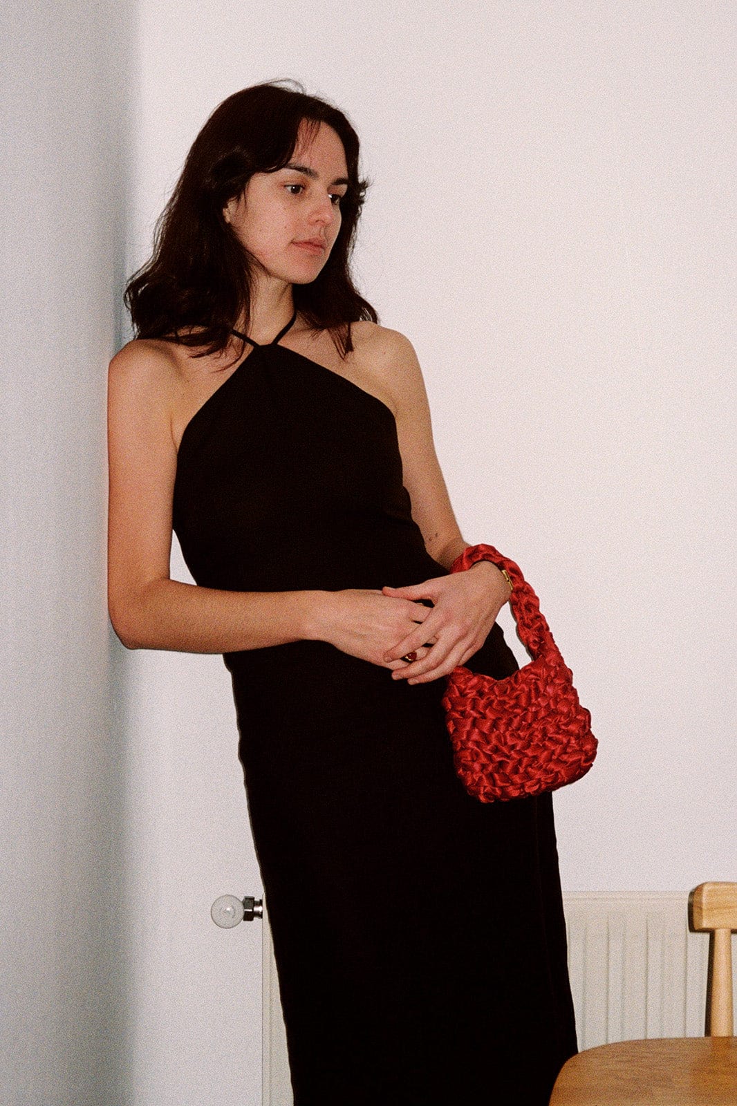 Leave the shiny sequins at home and celebrate the new year in this alluring, elegantly cool halterneck dress.