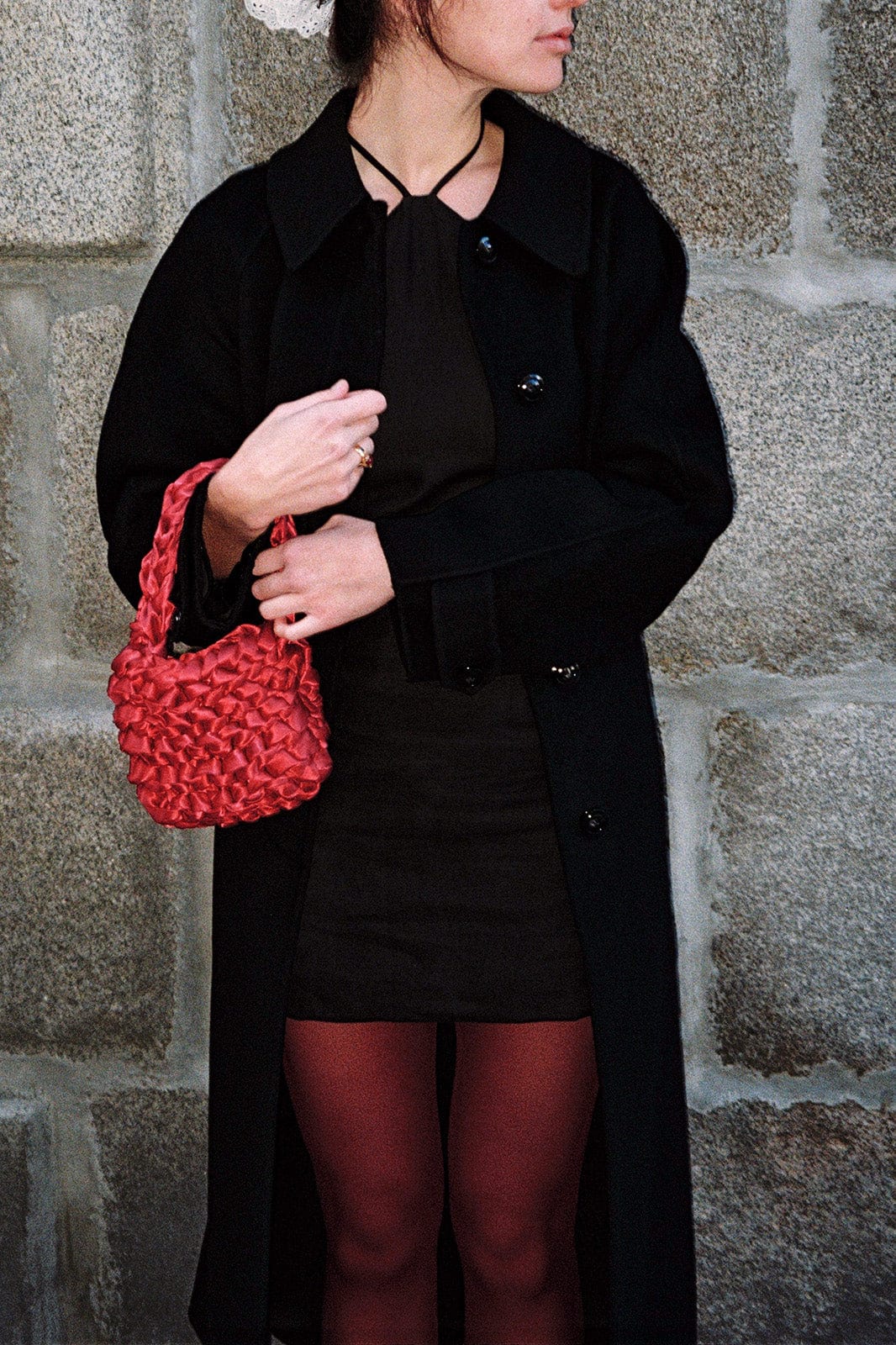Pair this black mini dress with red tights worn over a pair of strappy heels and a masculine coat to make this a wearable yet festive look.