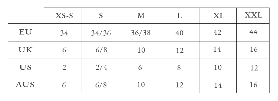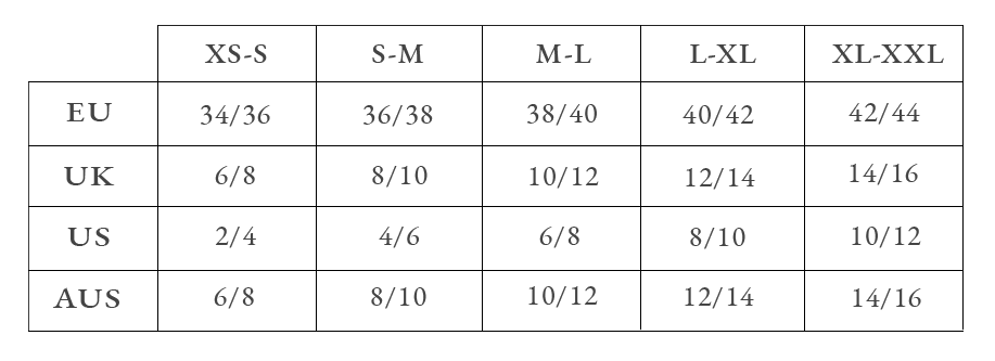 Please note that this is a general guide to sizing. For more detailed sizing information, please refer to the full measurements in each item description. In case you're unsure which size you are or if you can't find your size, please get in touch at hola@arkitaip.com.